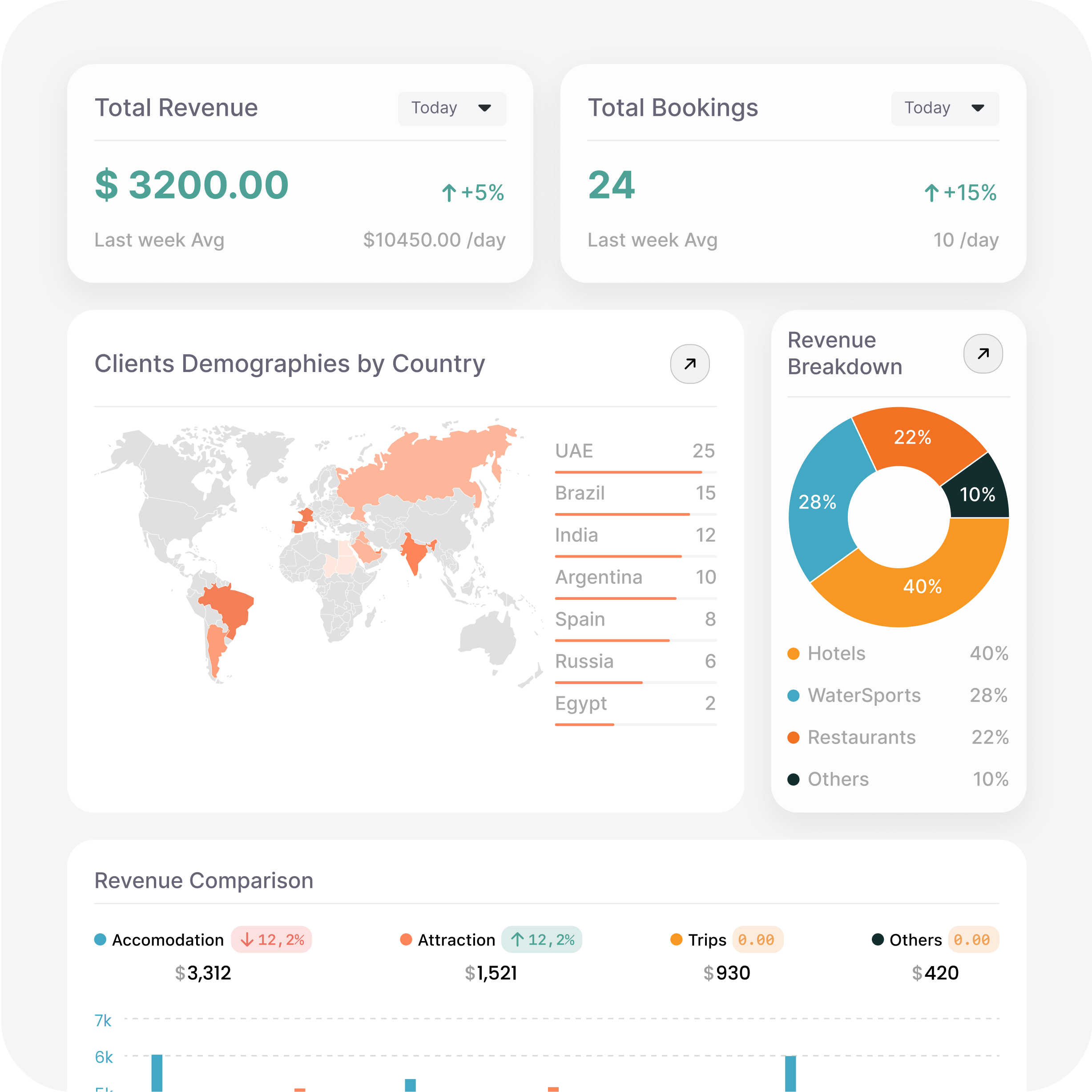 Get actionable analytics on traveler behavior, bookings, and upsells.